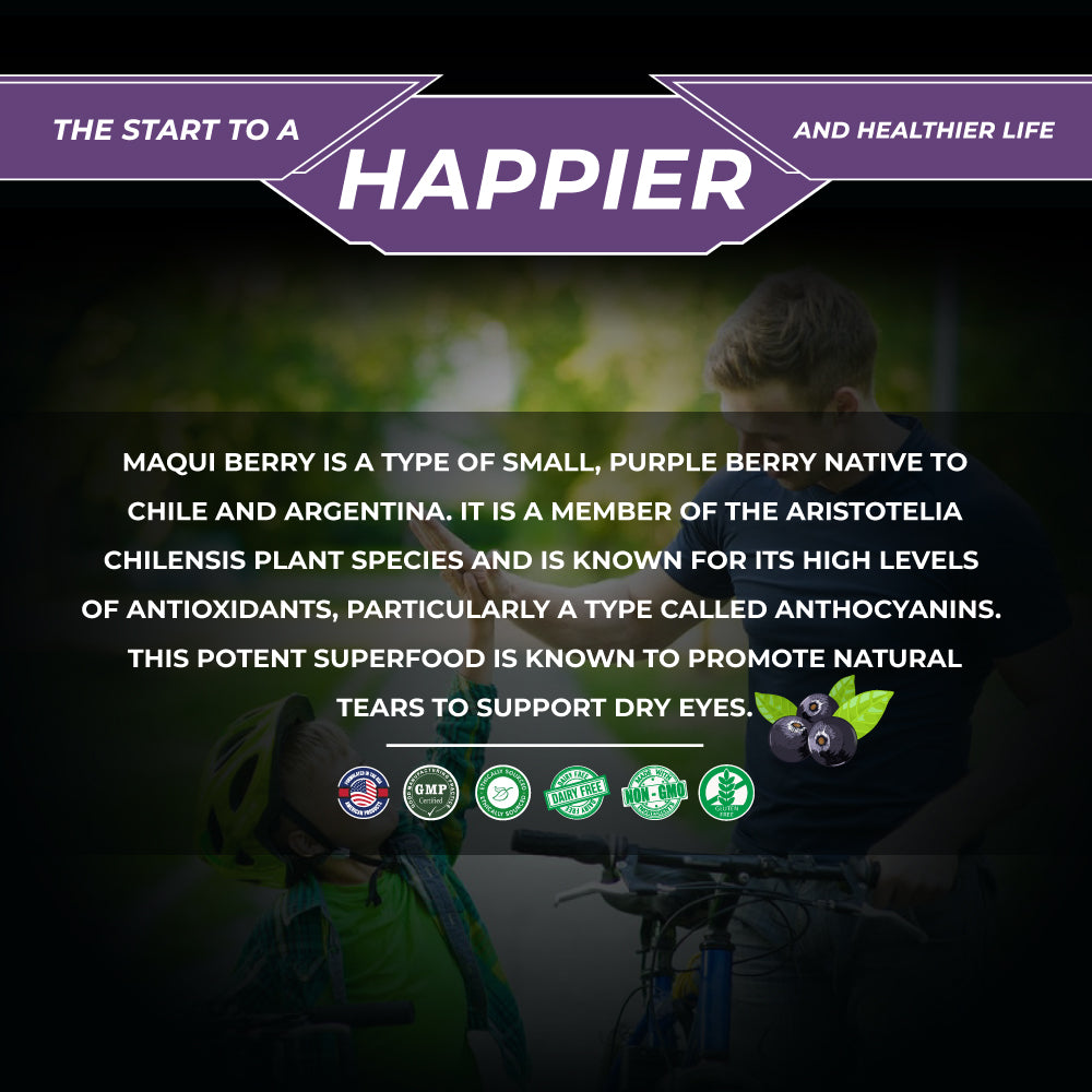Maquie berry contains anthocyanins, polyphenols, anthocyanins, triterpenes, and flavonoids that benefit health by neutralizing cell-damaging free radicals.* Maqui berry comes from the patagonia region of Chile and Argentina, where the Mapuche Indians have been using them for centuries to help support strength, endurance, and overall vitality.* It supports your immune system and dry eyes.*